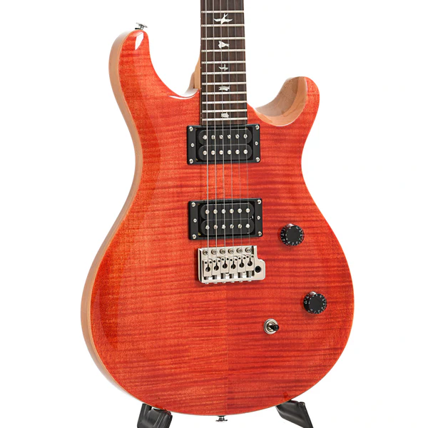 PRS SE CE24 vs SE Standard 24: A CE24 oferece acabamento flame maple e acabamento Blood Orange superior em aparência e presença, enquanto a Standard foca no essencial com preço mais acessível.