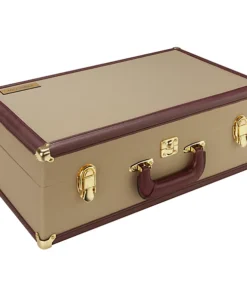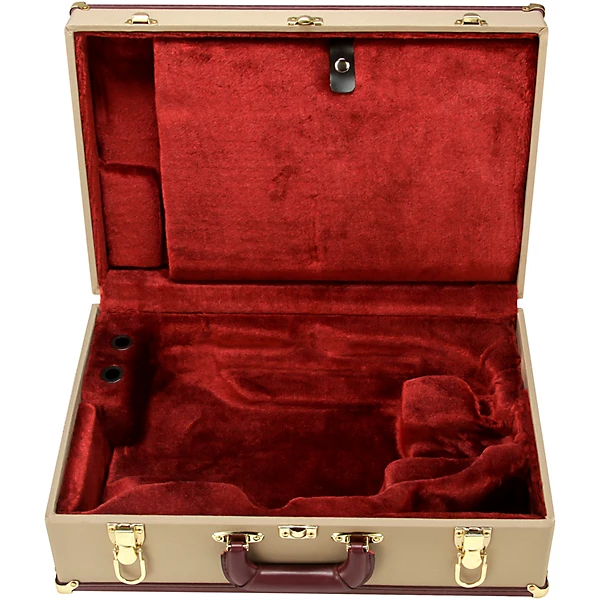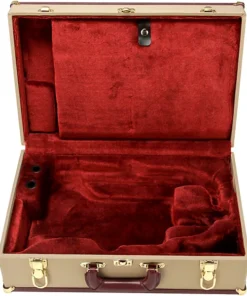 Além disso, o trompete acompanha um estojo deluxe de madeira, revestido com tweed vintage cor bege, acabamento marrom texturizado, interior em veludo burgundy, e uma manta protetora macia para o instrumento — garantindo segurança e estilo.